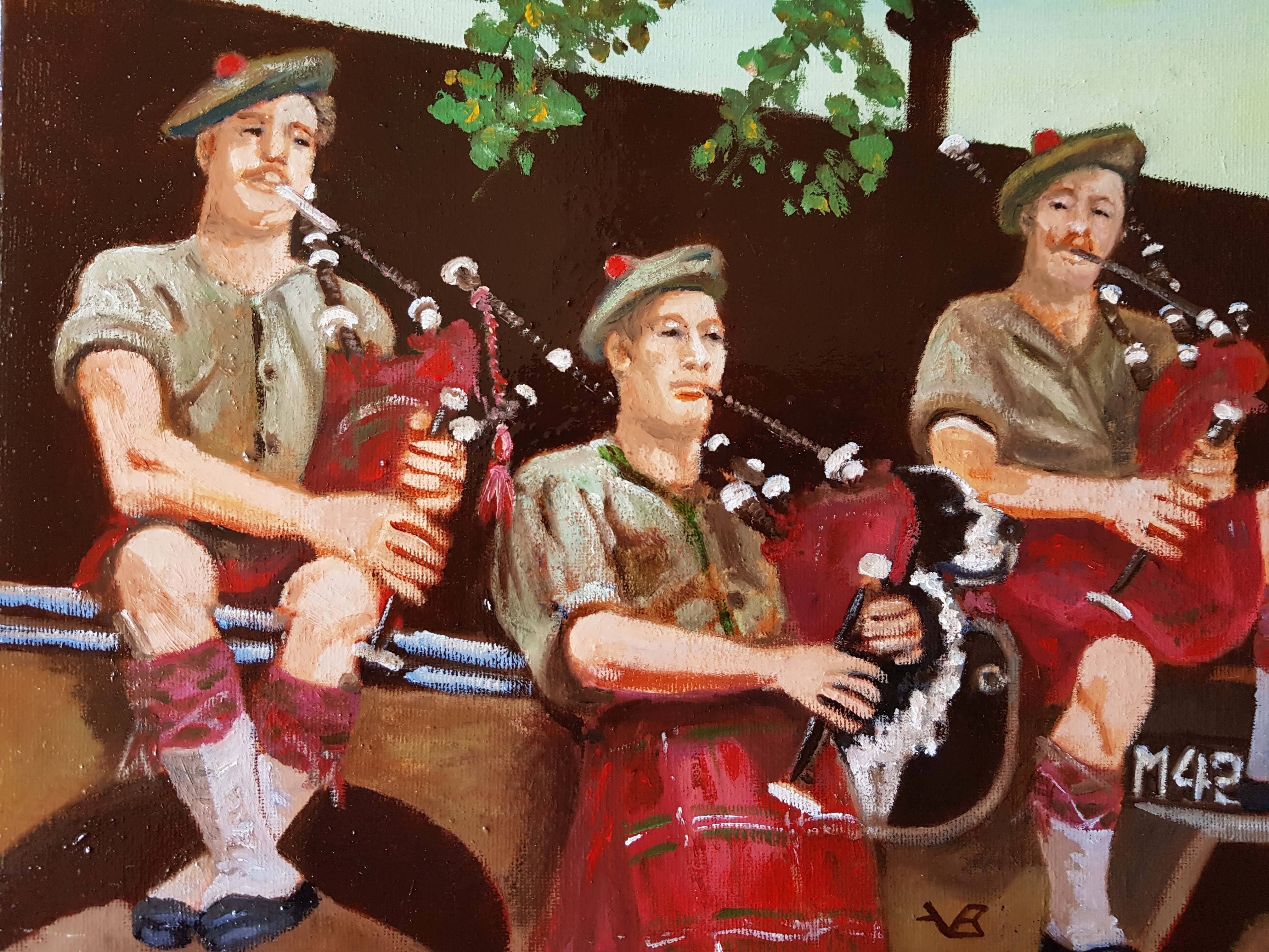 I had already started making some paintings of the liberation (see above here), which we presented to our liberators, and as all the photographs that were left from the liberation are only in black and white, I intend to make a full set of drawings of the pipers or drummers of all the Canadian regiments, as they were dressed over here during and after the Liberation,