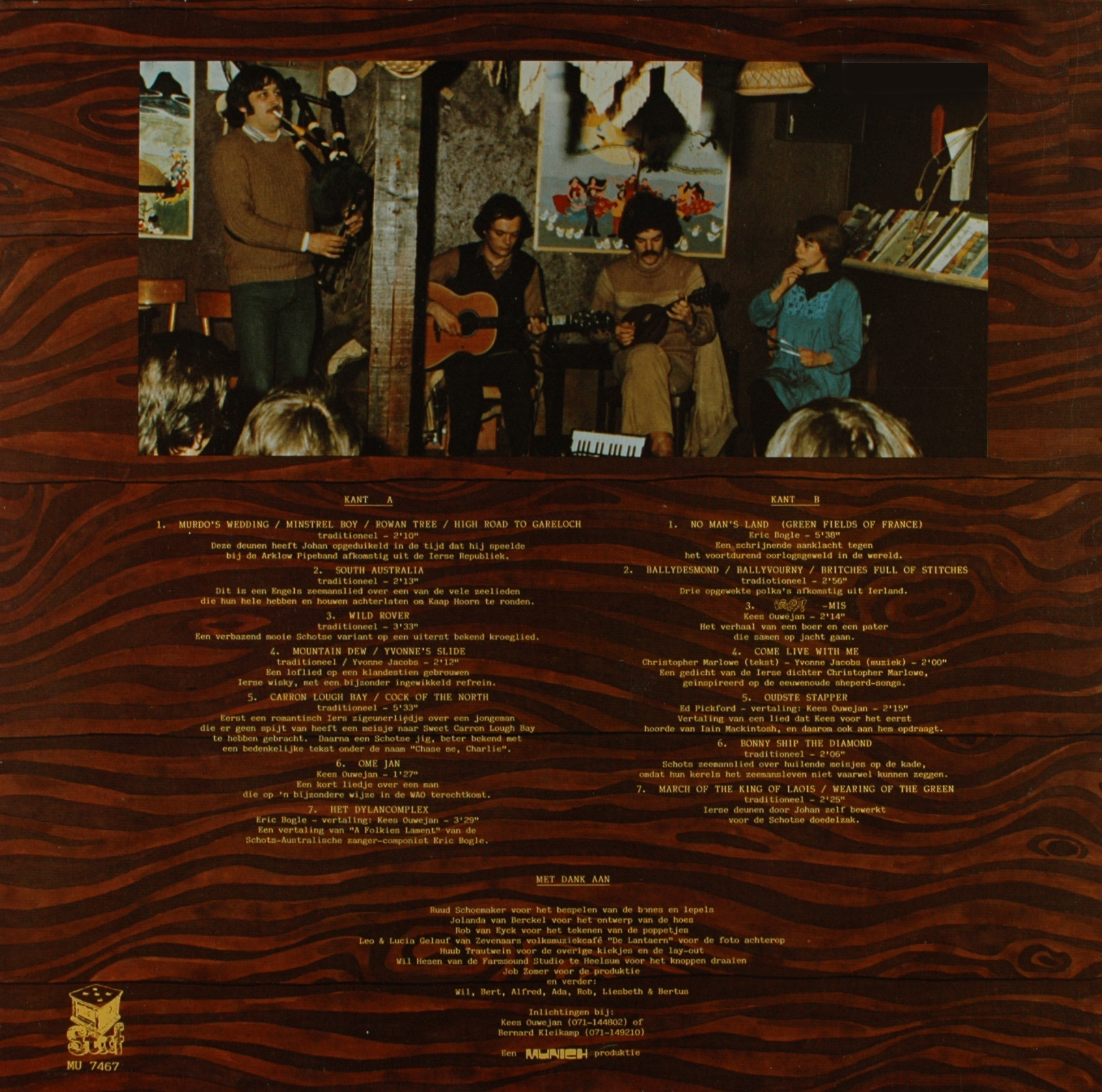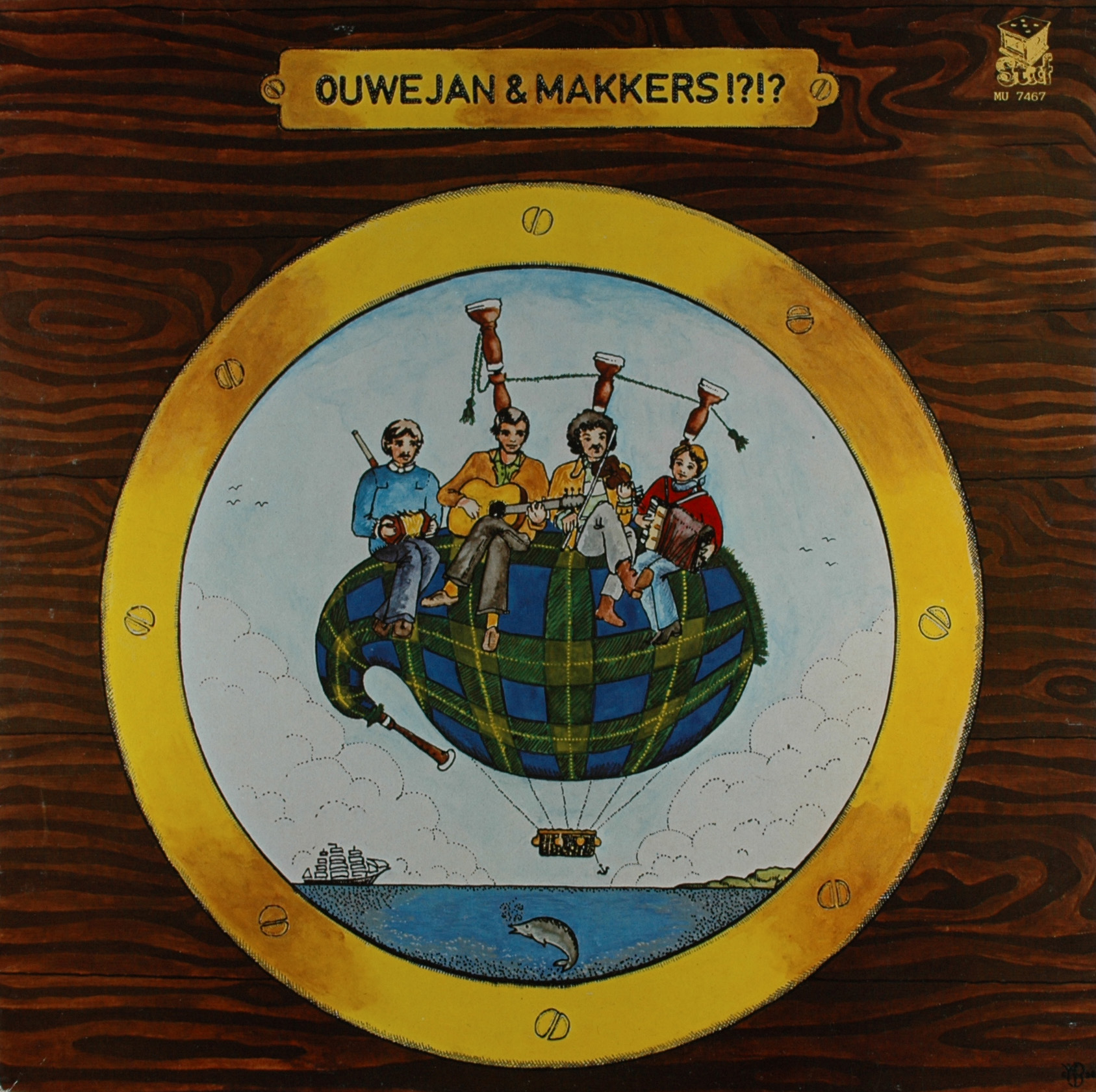 When first I met John, he was still heavily involved in playing with folk groups, and I had the opportunity to make (see above here) the drawings for the record sleeve of the L.P. of one of the popular folk groups he then played in, which went by the name of "Kees Ouwejan en Makkers". This was some thirty years ago and at that time, which was here called the "Folk Revival" in Holland, it was still quite novel to combine the traditional instrumental sound of the Great Highland Bagpipes with the songs of folk music. And the mouth blown type of chamber pipes which was then used for accompanying folk songs, (in this case with a concert pitch "A" Alexander chanter, with added high b top key) was then not as readily available as it is nowadays.